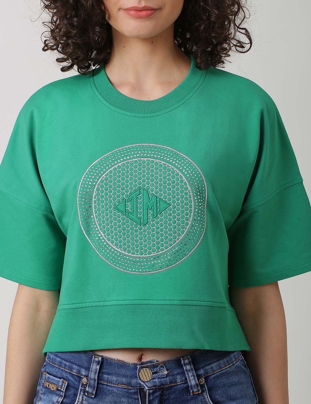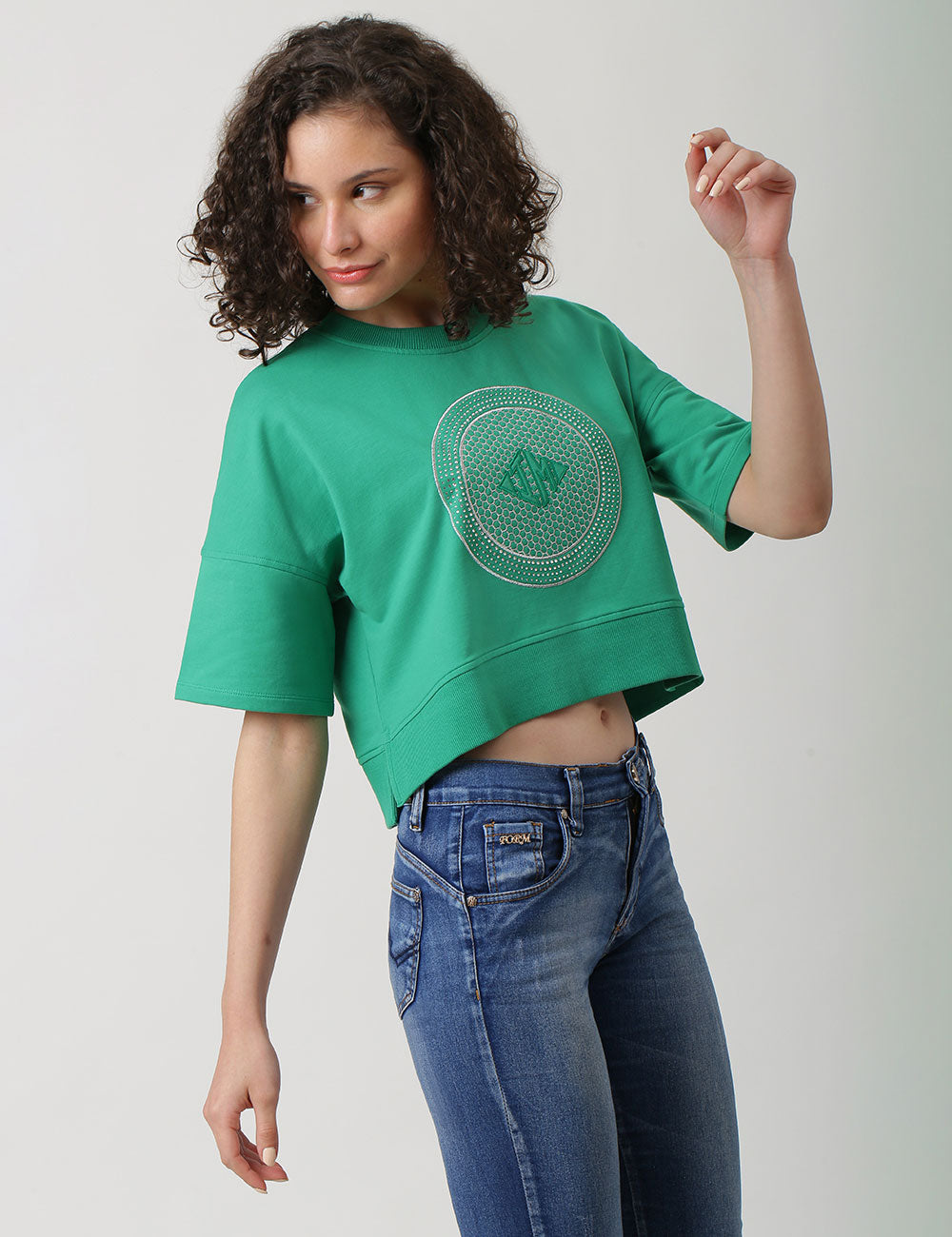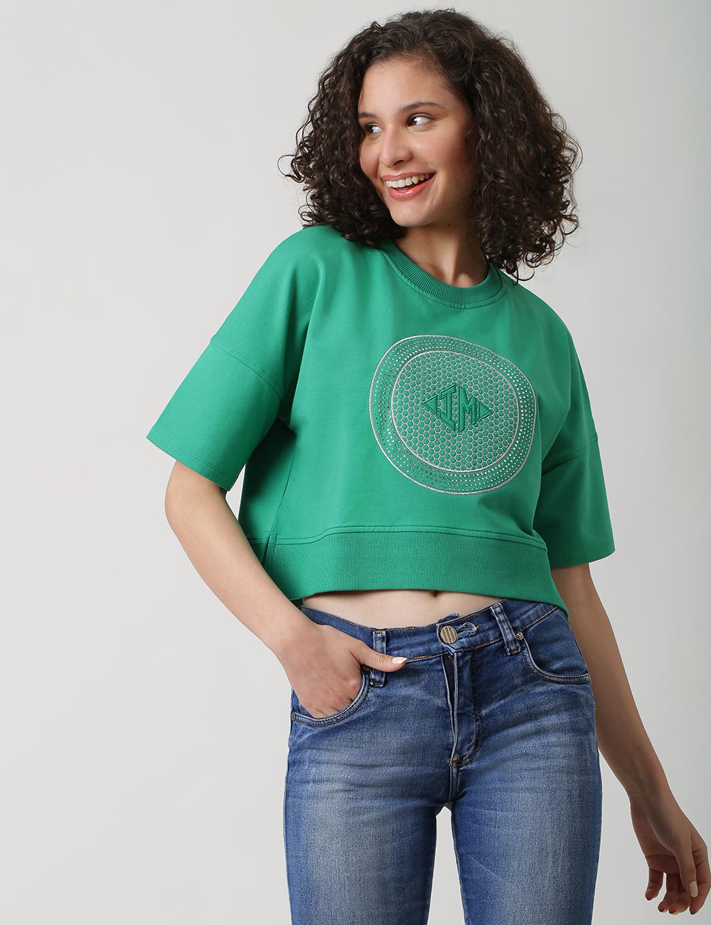 Loose Drop Shoulder Crop Top, Has A Relaxed Fit For Maximum Comfort.Oversized Sleeves And Round Neck With Branding At The Front. Team It Up With Jeans.