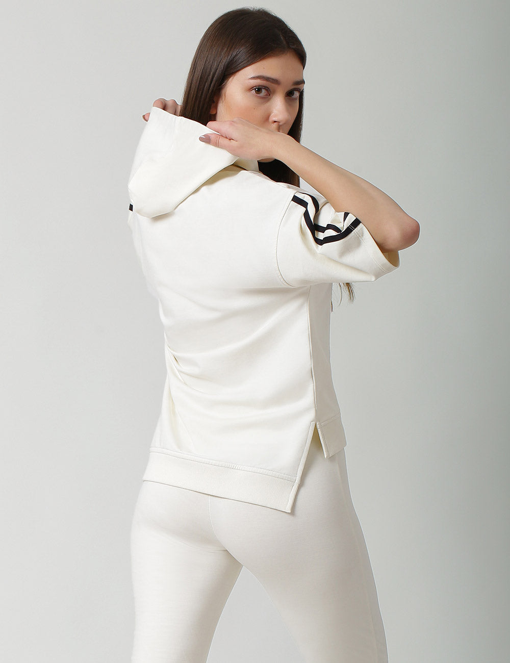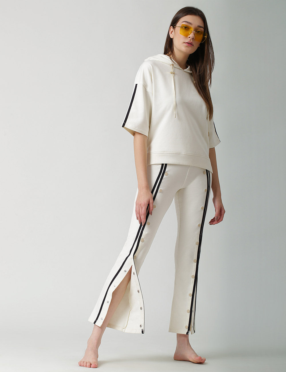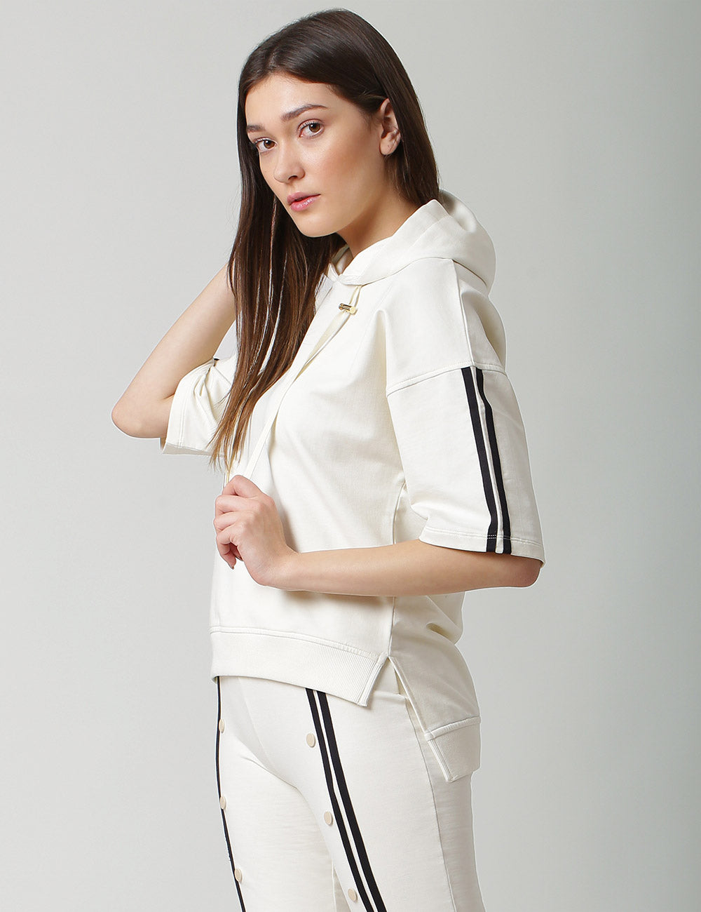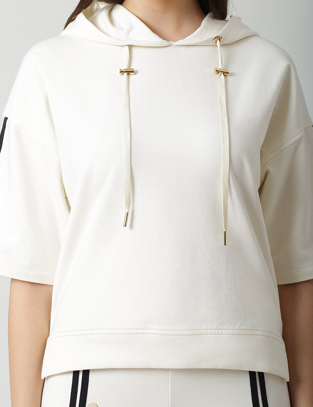 Boxy Fit, Dropped Shoulder, High Low Hem Hoodie. Hood With Drawstrings And Shiny Metal Trims. Style It With Oue Matching Fit And Flare Trousers Or Skinny Jeans.